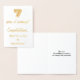 This gold foil wedding anniversary card design features a message like "7 years of marriage! Congratulations, Betty-Lou & Andrew!" on the front. The married couple’s names ("Betty-Lou & Andrew") can be changed to personalize the card. The inside features a customizable message like "May your 7th wedding anniversary be a happy and joyful one!". It could be given to a married couple who are celebrating their seventh wedding anniversary. [~Z0000048]