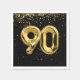 Gold mylar party balloons on black with gold star confetti for 90th birthday.