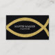 A gold foil christian fish takes center stage on this religious-themed business card. The foil color of the fish really stands out on the deep black paper that's been chosen for this business card. This church-themed design is perfect for pastors, ministers, reverends, or any other christian. This business card is also fully customizable, so that you can add your information on the front with more detailed contact information on the back.