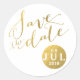 Gold Foil Glamor Handwriting | Save the Date Stickers. Elke Clarke© Modern minimalist design with the words "Save the Date" in gold handwriting script. A gold dot for the wedding date and white text for the wedding date. Gold foil is a printed photo effect. Other colors available in or shop.