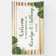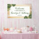Celebrate in style with this stylish and very trendy wedding welcome banner. The design features a chic striped white and gold foil effect background with tropical palm leaves and matching wording in a deep shade of green... stunning and simply perfect for any couple planning a destination or beach themed wedding celebration. This design is easy to personalize with your special event wording and your guests will be thrilled when they see this fabulous banner.
