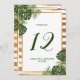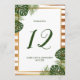 Celebrate in style with these stylish and very trendy wedding table number cards. The design features a chic striped white and gold foil effect background with tropical palm leaves and matching wording in a deep shade of green... stunning and simply perfect for any couple planning a destination or beach themed wedding celebration. The design is easy to personalize with your special event wording and your guests will be thrilled when they see these fabulous table numbers.