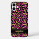 Customize this gold foil leopard print on a hot pink brushed metallic background iPhone 16 plus case with your your name in a trendy modern script font in a coordinating gold on black. So chic!