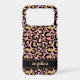 Customize this gold foil leopard print on a pink brushed metallic background iPhone 17 pro case with your your name in a trendy modern script font in a coordinating gold on black.