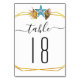 Gold foil polygon and seashells summer beach wedding table number card. It features text in cursive script handwritten calligraphy, a gold polygonal frame and three seashels in beige and blue on the upper part.