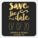 Modern Save the Date Sticker with cute gold foil (printed effect) bold script typography on a black background. Elke Clarke ©