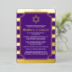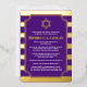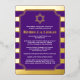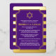 This fully customizable Bat Mitzvah invitation has a real gold foil striped border on a purple background with the name of the Bat Mitzvah in gold foil, too, along with a Star of David at the top. The rest of the wording is white and carries over to the backside where reception or party details can be printed, while the front side contains RSVP details, making this a luxurious all-in-one Bat Mitzvah invitation with a lot of bang for your buck. You can also select silver or rose gold foil colors and you can change the color of the purple background to whatever color you want using the "edit using design tool" mode. If you need assistance to add a Hebrew name, email niteowlstudio@gmail.com.