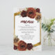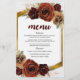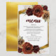 This wedding menu features rustic oil painted burgundy earthy toned autumn fall flowers over greenery and pampas grass with an elegant gold foliage frame and background.