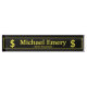 This name plate or desk sign has a gold frame and gold lettering with Dollar graphics at the edges. The main background and frame background colours can be changed to suit your own requirements. All of the text can also be changed.