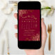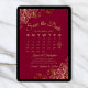 This Save the Date card features a beautiful design with gold script lettering on a maroon or burgundy red background, and frilly faux foil gold frills in the corners. There is a customizable calendar where you can put a heart around your wedding date. There is space for the couple's name, wedding location, and website. Elegant and chic way to let your friends and family know to save the date for your special day.