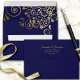 This beautiful wedding envelope is features a navy blue colored background with gold floral curls and swirls on the inside flap. There is a printed return address on the back flap in fancy script lettering. The design is understated and simple, yet classic, chic and ornate. Perfect way to make your wedding invitations all the more special.