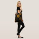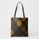 Trendy gold geometric abstract circles pattern over black background. Customizable tote bag template