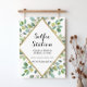 This gold geometric calligraphy selfie station sign is perfect for a rustic wedding or bridal shower. The design features hand-drawn botanical green eucalyptus branches and leaves adorning an elegant geometric frame.