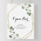 This gold geometric calligraphy wedding open bar sign is perfect for a rustic wedding. The design features hand-drawn botanical green eucalyptus branches and leaves adorning an elegant geometric frame.
