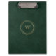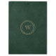 This elegant design features a gold monogram initial in open serif font framed by three irregular gold wire circles on a dark green background.