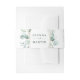 This wedding invitation belly band features painted watercolor eucalyptus and botanical green leaves with a gold geometric frame.