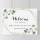 This gold geometric greenery wedding welcome sign is perfect for a rustic wedding. The design features hand-drawn botanical green eucalyptus branches and leaves adorning an elegant frame.