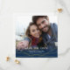 This square save the date wedding announcement card features a photo frame that fills the entire front of the card. A navy blue gradient and simple gold lines accent the bottom of the photo. Custom text allows you to add the names of the bride and groom and their upcoming wedding date and location.