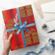 A very stylish and festive modern Christmas wrapping paper, featuring a pattern of gold gift boxes with large bows on top, in a pattern over a bright, metallic red background.