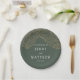 Modern and elegant wedding paper plate featuring gilded hand drawn tropical greenery of banana leaves. The lines of the palm leaves are in faux gold glitter. The background is green. Customize this product by adding your own wedding information. Great for destination or beach wedding in the summer.