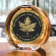 Gold Glitter maple leaf with black background for maple syrup round label with farm name, net weight, and address. You can edit the details according to your needs.