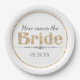 These glamorous party plates feature a bachelorette, bride-to-be theme. The phrase "Here comes the bride" is printed across the center, with "Bride" printed in a gold glitter font. A luxurious band of diamonds is printed below it. A sample wedding date is printed at the bottom which you can personalize to include your own date or other custom text.
