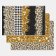 Three modern wrapping paper sheets. A black, leopard, buffalo plaid and gold glitter wrapping paper sheet, a gold glitter wrapping paper sheet and an animal print leopard wrapping paper sheet. Please note there is not actual gold glitter on the wrapping paper, but a design effect. A beautiful touch to birthday gifts, retirement gifts, decoupage and more.