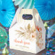 Elegant and stylish floral birthday favor box features stunning watercolor yellowish orange flower with beige leafy greenery and long gold glitter rain garland.