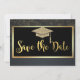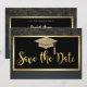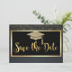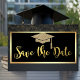 Elegant gold glitter graduated cap, and confetti on a black background.