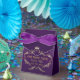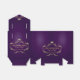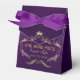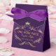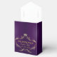 Elegant deep purple background with gold and white glitter texture crown and swirls frame, customizable text favor box design.