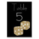 This glamorous custom table number card features a gold and black casino design. An image of large, gold glitter dice is printed across the center over a black background. You can personalize the table card to include your own custom name or text.