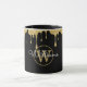 Chic gold glitter drips, script name, and gold monogram on a black background mug. You can personalize the name, monogram and customize the font and colors to create your own unique design. Designed by Thisisnotme©