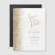 The left-hand edge of this elegant modern wedding save the date card features a gold faux glitter border. The customizable text combines gold-colored handwriting, copperplate and italic fonts on a white background.