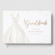 Elegant bridal shower guest book feature watercolor white wedding dress with sparkle faux gold glitter guest book script.