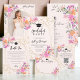 Class of 2024!! A chic spring, summer pink, purple and orange floral watercolor and gold glitter confetti typography graduation welcome sign with hand painted flowers, greenery watercolor leaf branches with gold geometric terrarium frame on blush pink background.