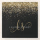 Glam Gold Glitter Elegant Monogram Glass Coaster. Easily personalize this trendy chic glass coaster design featuring elegant gold sparkling glitter on a black background. The design features your handwritten script monogram with pretty swirls and your name.