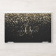 Glam Gold Glitter Elegant Monogram Laptop Skin. Easily personalize this trendy chic laptop skin design featuring elegant gold sparkling glitter on a black background. The design features your handwritten script monogram with pretty swirls and your name.