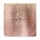 A trendy design of faux brushed rose gold metal background and gold glitter with gold monogram and black script name.