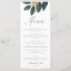 Menu for any wedding celebration with gold glitter, greenery leaves, and caligraphy names.