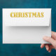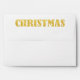 Christmas envelope with Merry in gold glitter, fancy font on the front and Christmas in gold glitter on the back. A gold foil stripe borders the front of the envelope. Personalize it with your name and address in the corner with the template provided. The inside of the envelope has gold snowflakes all over.