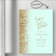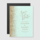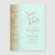 The left-hand edge of this elegant modern wedding save the date card features a gold faux glitter border. The customizable text combines gold-colored handwriting, copperplate and italic fonts on a mint green background.