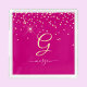 A trendy design of gold glitter with gold monogram and white script name on fuchsia background.