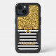 Cute, fun, girly, gold glitter effect PRINTED design with a printed satin golden bow and GOLDEN text on black AND WHITE STRIPED BACKGROUND in a modern font! You can personalize with your name, your text, your monogram, or your initial to have it monogrammed in a bold script font. A stylish, fashion trendy, chic design for her.