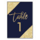 Gold typography on customizable navy blue gold glitter color block, and faux gold geometric stripes chic table number wedding , perfect for elegant, beach wedding,