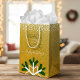 “Peace, joy & love.” A giant, fun, playful, white and dark green snowflake illustration and modern typography on a sparkly, faux gold glitter background help you usher in the holiday season. A white confetti dot border frames the top. Feel the warmth and joy of the holidays whenever you use this stunning, graphic, personalized medium size gift bag. Matching envelopes, stickers, tote bags, wrapping paper, pillows, home décor, and more are also available. Turns a great present into something even better!