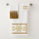 Add some winter sparkle to your bathroom with these elegant gold snowflake towels printed on a snowy white background. Perfect decorations for the winter holiday Christmas season.