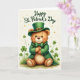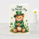 This card shows a soft brown teddy bear sitting upright on a patch of green ground, looking out with a tender smile and rosy cheeks that feel friendly and affectionate 💚. The bear wears an emerald top hat with a gold buckle, a matching long coat with small gold buttons, and a neat green bow tie, all painted with a plush, cozy texture. Above the bear, the words “Happy St. Patrick’s Day” appear near the top in green, flowing lettering that arches gently across the cream background ☘️. The bear’s relaxed pose and warm gaze give the scene the feel of a sweet hello shared between close friends. Small shamrocks sit around the bear at ground level, adding little touches of Irish charm without crowding the scene. Tiny gold glitter-like flecks are scattered across the background, catching the light like soft sparks. The background stays creamy and bright, with a light glow that makes the greens and golds stand out. The overall layout keeps the text up top, the bear centered, and the shamrocks low along the base.