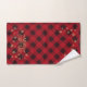 Cute Christmas bath towel set features a red festive plaid background, gold glittery snowflakes, a gold glittery typography Merry Christmas and tree leaves.