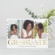 Choose three of your favorite photographs and upload them to personalize these trendy graduation announcement cards. This graduation design features the word "GRADUATE" in a faux gold foil typography, and three photos placed on top of simple gold foil stripes on a white background. On the reverse, there is a classy white polka dot pattern on a soft gray background color.