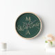 Trendy, contemporary, modern, elegant gold foil and emerald green personalized wall clock, perfect wedding gift for bride and groom with monogram and adorable romantic love couple birds hand - drawing.